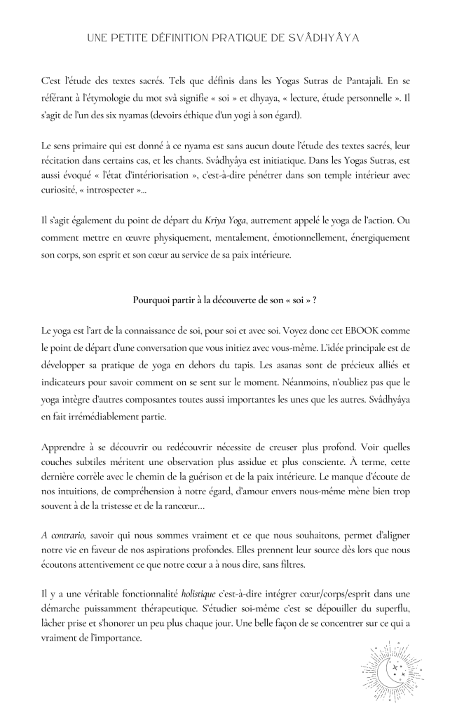 Écrire son histoire en se prenant par la main… Tel est le dessein de cet ouvrage que j’ai décidé de baptiser « Svadhyaya ». Une douce étude de son temple intérieur pour se découvrir un peu plus, chaque jour. Grâce à des exercices interactifs d’écriture, des méditations, des citations et des affirmations pour cultiver la pensée positive, initiez un voyage initiatique vers le soi, avec soi et pour soi.
